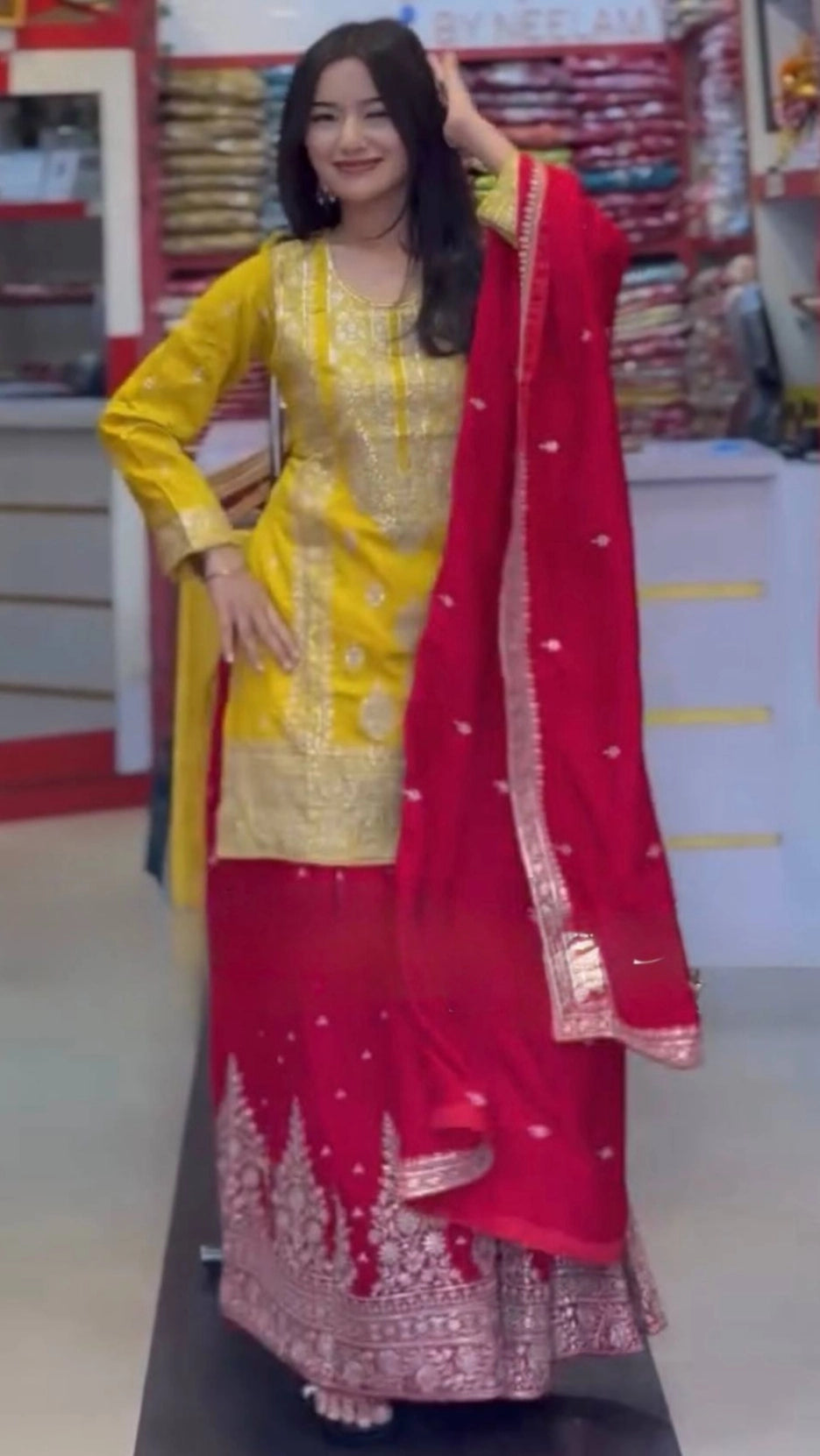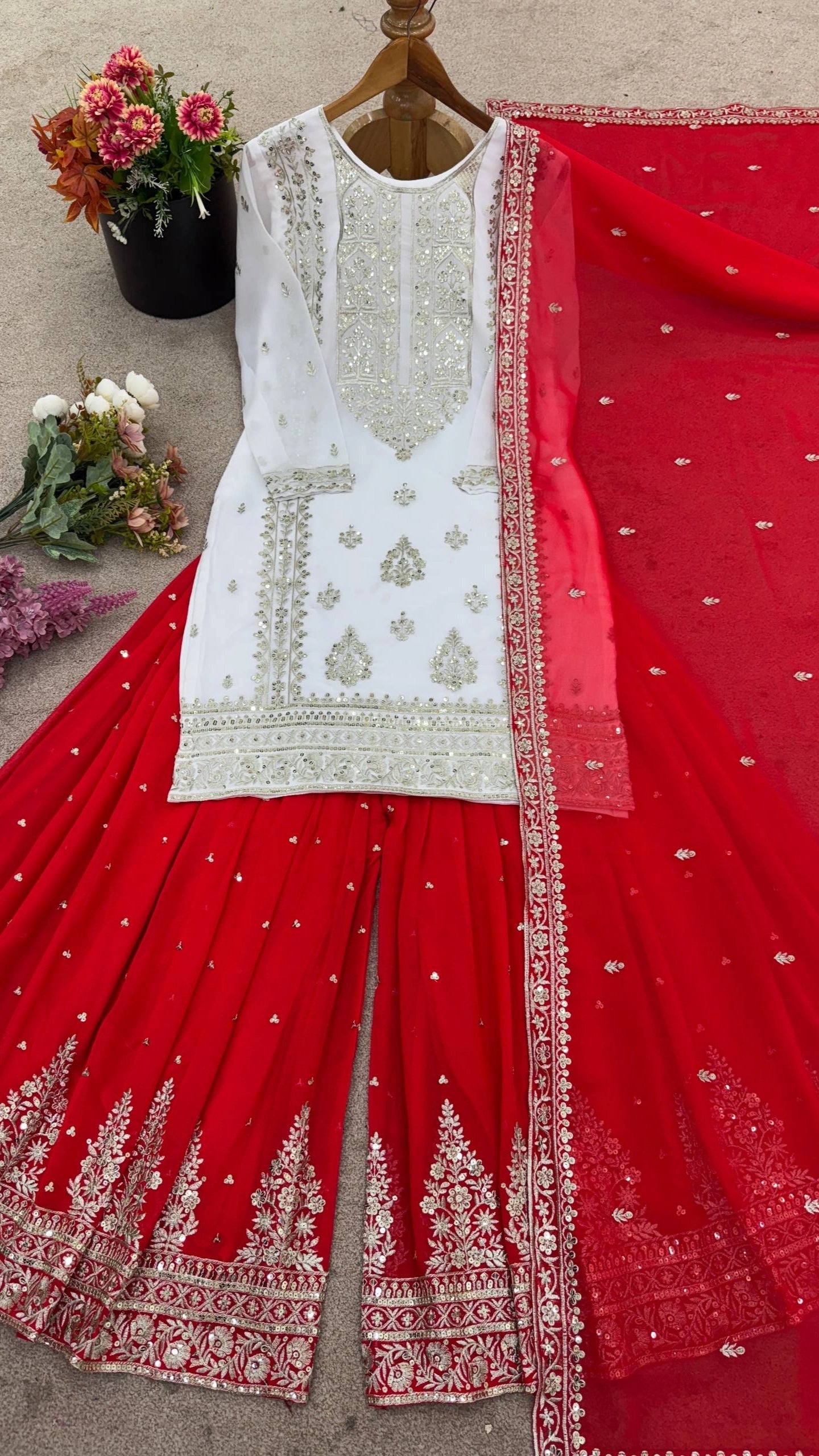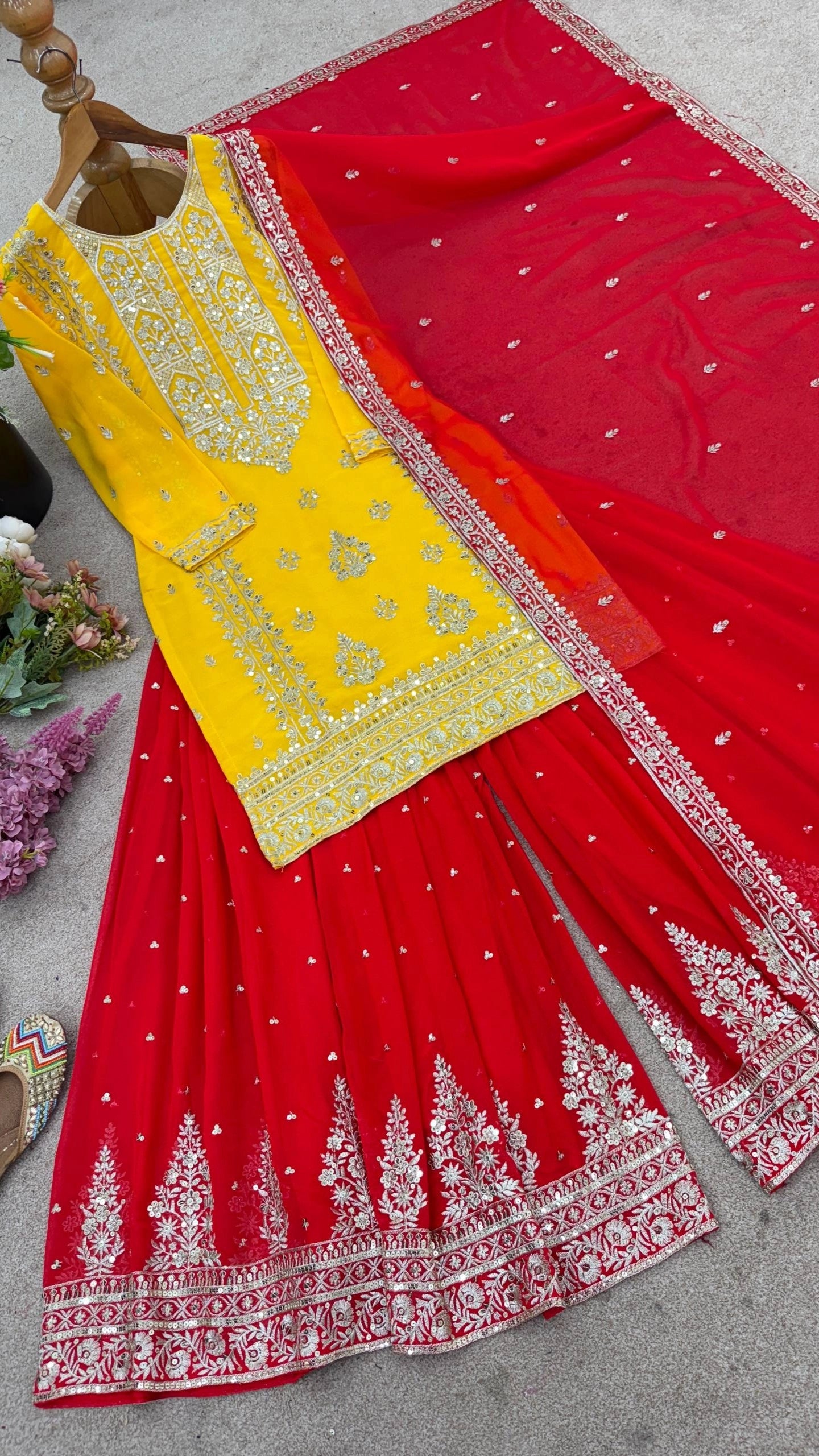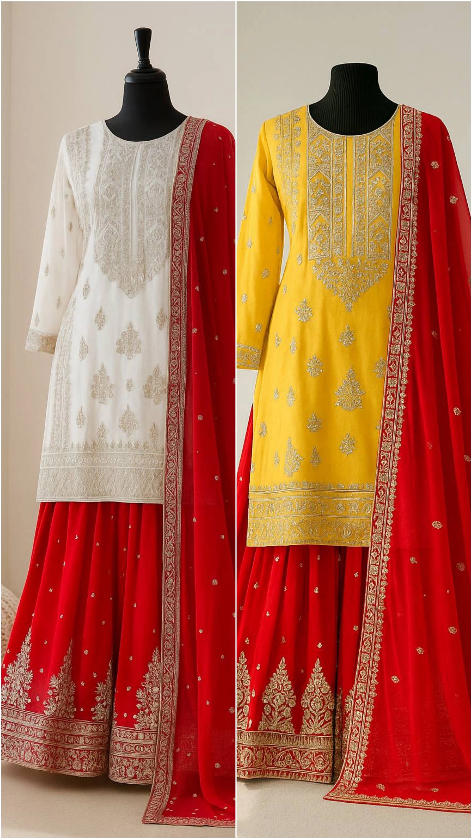 DESIGNER WHITE & YELLOW KURTA SHARARA SET WITH RED DUPATTA | LUXURY EMBROIDERED SUIT FOR WOMEN | WEDDING & FESTIVE COLLECTION