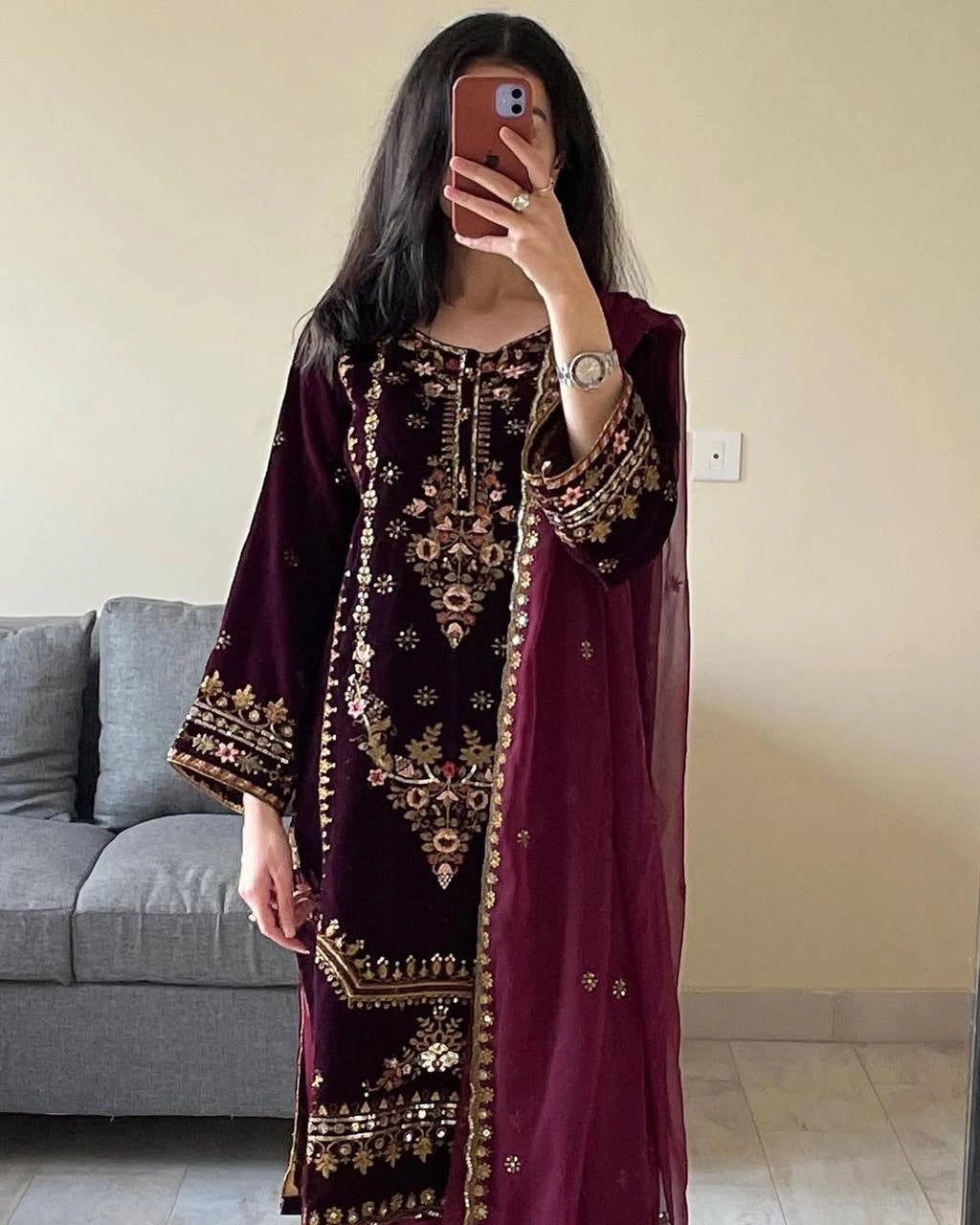 *FOR THIS WINTER SEASON OUR NEW DESIGNER STYLE VELVET EMBROIDERY WORK SUIT PANT WITH DUPATTA*